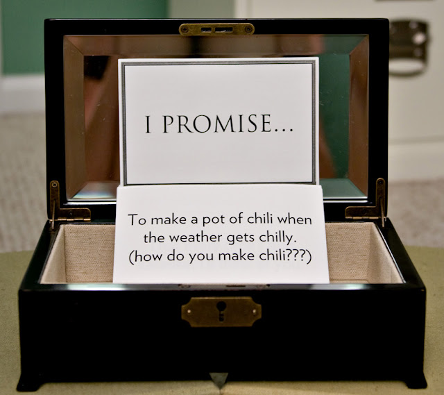 As a family, we came together the weekend before Christmas to celebrate with my Mom. I waited until the house quieted down that night, sat all my brothers and sisters down around the living room, and handed my Mom her present. The gift was a simple box with the words "I Promise..." on the inside lid. She opened the box and read each card aloud for all of us kids to hear. Each card was something I promised my Mom I would remember or do after she was gone.